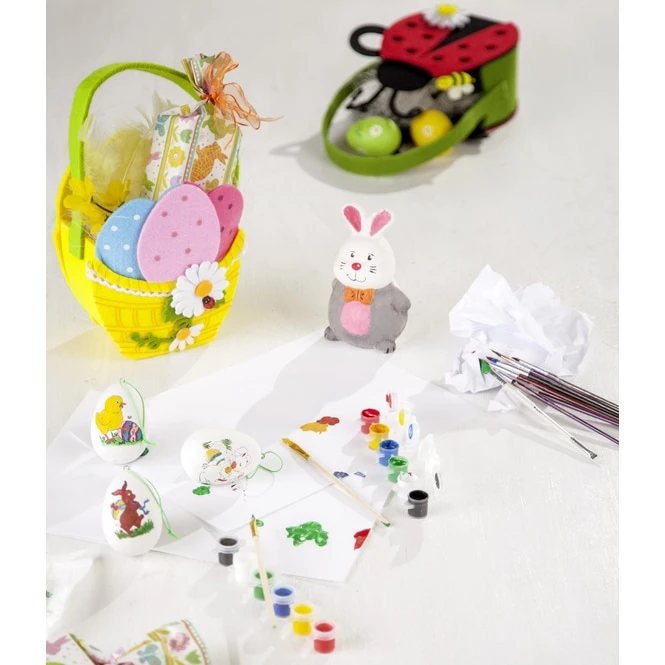 Bunte Eier und leckere Süßigkeiten sind in der österlichen Zeit einfach unerlässlich und dürfen weder bei Jung noch Alt fehlen. Denn die prall gefüllten Nester bringen nicht nur die Kleinen im Handumdrehen zum Strahlen, denn auch Erwachsene haben großen Spaß daran, welche zu suchen, um sich anschließend über den köstlichen Inhalt herzumachen. Damit Sie die Leckereien in diesem Jahr auf besonders dekorative Weise verschenken können, haben wir hier genau das Richtige. Mit dem kunterbunten Osterkörbchen kommen Ihre Präsente in Form von Ostereier, Schokolade und Co. jederzeit optimal zur Geltung. Es besteht aus liebevoll gestaltetem Filz, misst ca. 16,5 x 8 x 26 cm und ist vor allem dank dem farbenfrohen Design ein fröhlicher Osterbote. Somit eignet sich der Korb nicht nur ideal, um die Eier vollkommen sicher aufzubewahren, sondern überdies auch, um die heimischen vier Wände in eine heitere Frühlingsatmosphäre zu tauchen und individuelle Akzente zu setzen. Also lassen Sie Ihrer Fantasie freien Lauf und schmücken Sie munter drauflos!